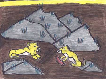I will begin my story at a place called Ostrich Kopje, to the south of Pride Rock. With many good cracks to squeeze into, overhanging rocks to hide under, and even a few burrows for the braver cubs to explore, it is the best place in the Pride Lands to play hide-and-seek. We had a lot of fun playing there with the others in the pride, There were other games we would play too, like 'wolf wolf'.