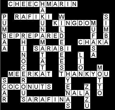 ![]() Across 1. Banzai's Voice 4. The only primate 7. Everthing that the light touches is Simba's _______. 9. The most of one species is shown in this scene 11. Simba and Nala's son 12. Simba's mother 15. Timon's species 16. What does "Asante Sana" really mean? 19. "I've got a lovely bunch of ________..." 21. Moira Kelly's voice 22. Nala's mother Down 2. It means "No Worries" 3. Warthog 5. "The herd is on the move, sire." Herd of what? 6. First to say "I laugh in the face of danger! Ha ha ha!" 8. "I just here that name and I shudder." Who's name? 10. First animal to appear 13. At the top of the food chain 14. "Nothing what's the _____ with you?" 17. First thing that Simba roars at 18. Killed by the hyenas 20. Banana Beak The Solution!The Pride Lands Online Fun Page Archive |